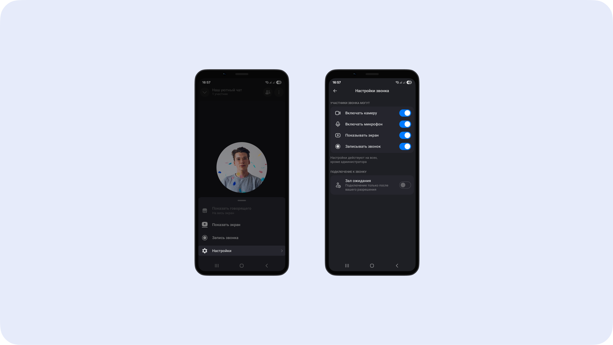 Создатель и администратор звонка с помощью настроек звонка может отключить для всех участников возможность включения: камеры, микрофона, показа экрана или записи звонка. При выборе пунктов настроек они распространяются на всех, кроме администраторов звонка.